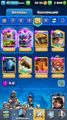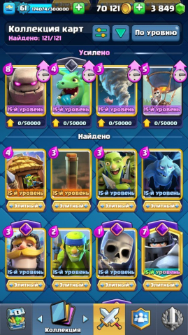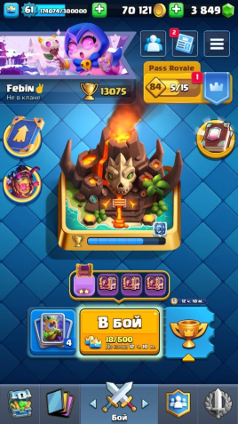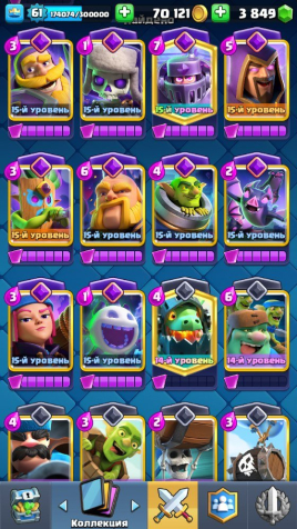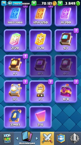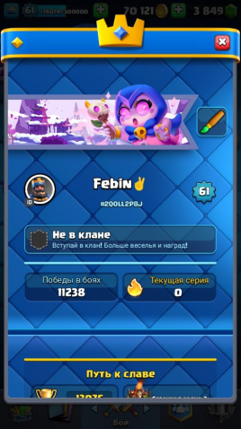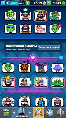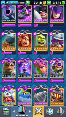 Краткое описание: 13 к 🏆, 61 лвл, 27 15 лвл + 89 14 лвл, колода с мегарыцарем, 20 эволюций, 140 эмодзи, описание 👇