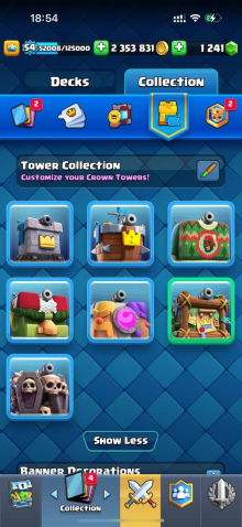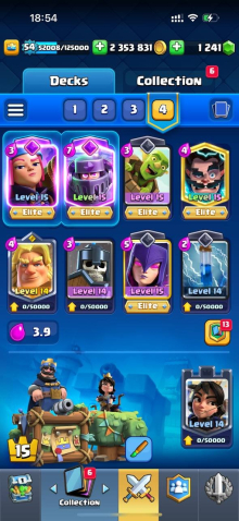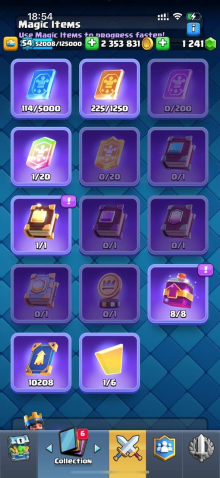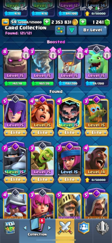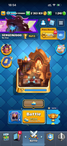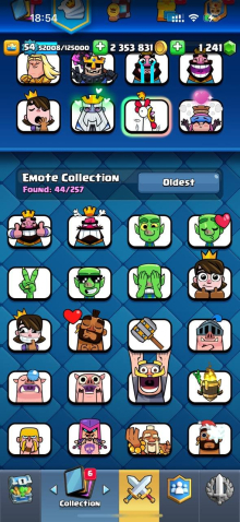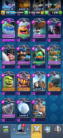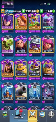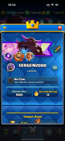 Краткое описание: 15 к 🏆, 54 лвл, колода с мегарыцарем, 7 15 лвл + 35 14 лвл, 9 эволюций, 44 эмодзи, описание 👇