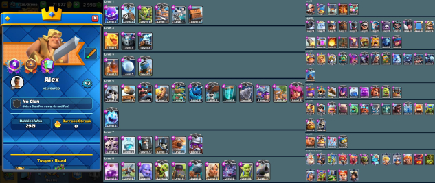 Краткое описание: CL4436 KT 14 LEVEL 43 | Trophies:5261 | 107 Cards | 4 Cards (14LVL) | 2 Tower Skins | 33 Emotes
