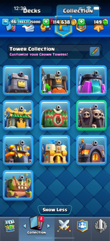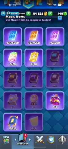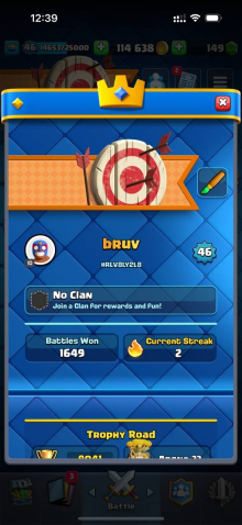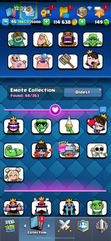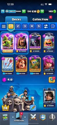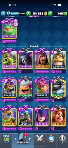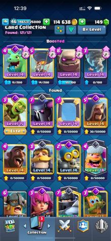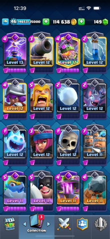 Краткое описание: 9 к 🏆, 46 лвл, колода с бочкой, куплен бп, 1 15 лвл + 10 14 лвл, 11 эво, 68 эмодзи, описание 👇