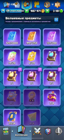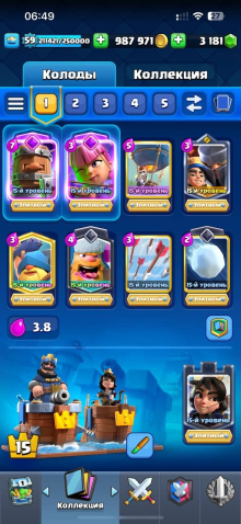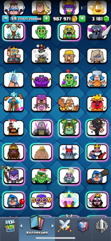 1/6 дракончик, 3/6 снежок, 2/6 дровосек, 2/6 стенобои, 3/6 палач, 2/6 клетка гоблина, 2/6 дудец, 3/6 зап, 2/6 пекка