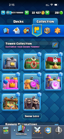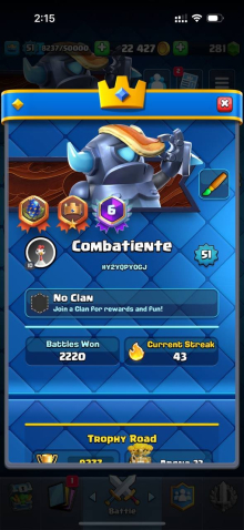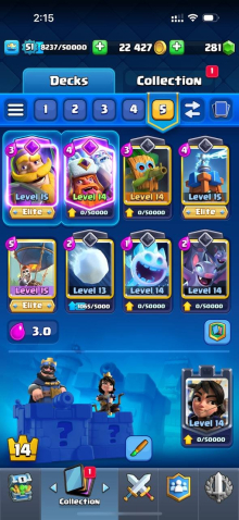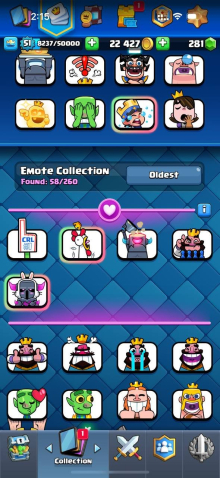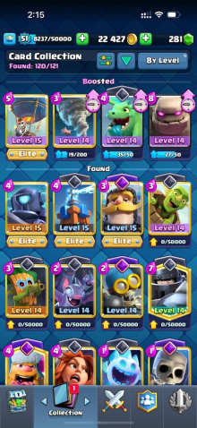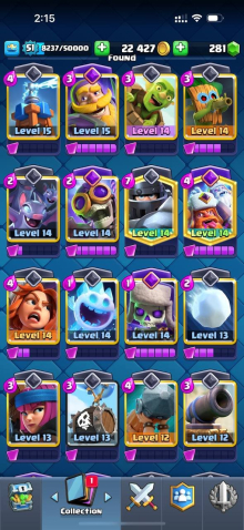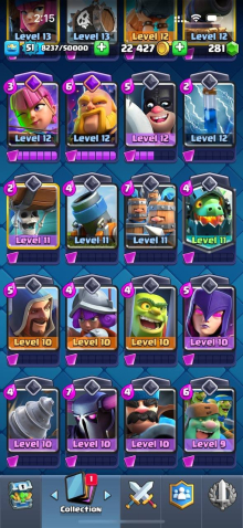 Краткое описание: 9.2 к 🏆, 51 лвл, колода с дровосеком, 4 15 лвл + 10 14 лвл, 6 эволюций, 58 эмодзи, описание 👇