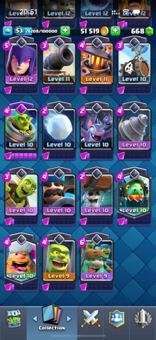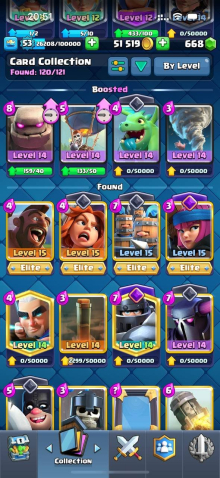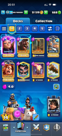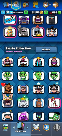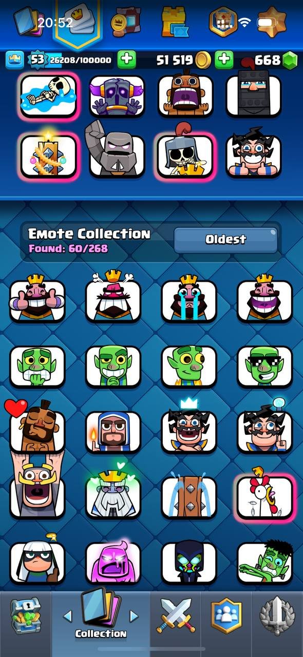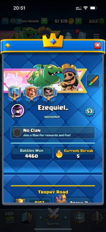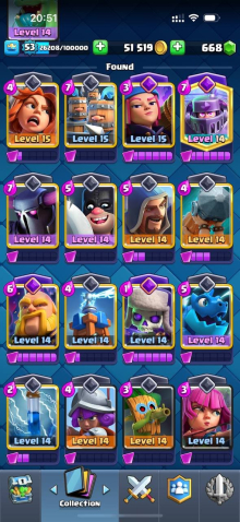 Краткое описание: 8.1 к 🏆, 53 лвл, 4 карты 15 лвл + 35 14 лвл, колода с хогом, 5 эволюций, 60 эмодзи, описание 👇