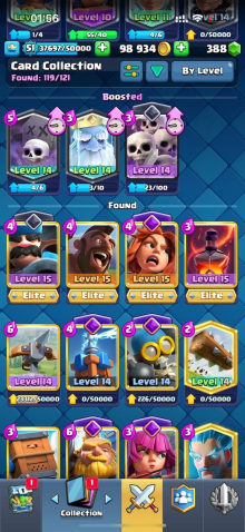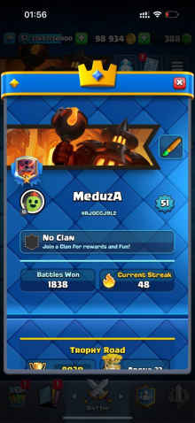 Краткое описание: 9 к 🏆, 51 лвл, колода с хогом, 4 карта 15 лвл + 6 14 лвл, 8 эволюций, 35 эмодзи, описание👇