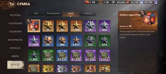 Почти все здания развиты до 25lvl, 46 героев всего, прокаченных до 60lvl половина, 10 из них легендарные, 8 пробужденных, плюс имеется не распределённый опыт и фрагменты. Ресурсов на 7млрд, ускорений на 400+ дней.