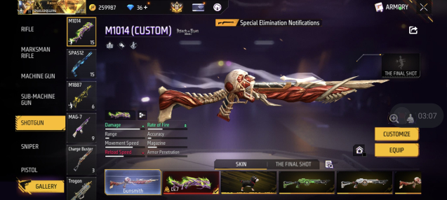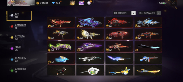 Оружий 774! А так же на аккаунте имеется редкий скинь на дробовик атака титанов!