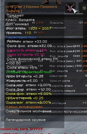 Сервер: Karos Reborn (karos.to) — ElysiumКраткое описание: 110+18 кинжал бродяга 02-0.25 5% физ атака