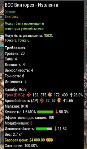 Сервер: RU-6Краткое описание: ВСС Винторез изолента Урон 25, кучность -58.3, износ -11.8(любой сервер)