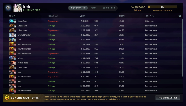 🏅 Рейтинг: 6500 MMR (6% уверенность) — доступна перекалибровка