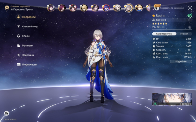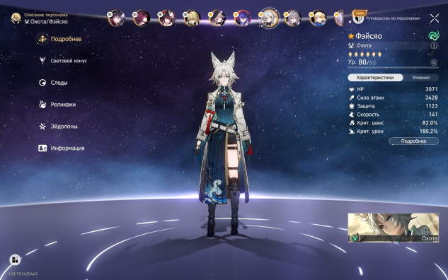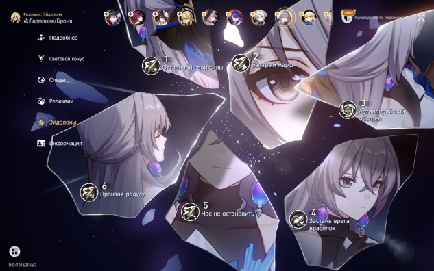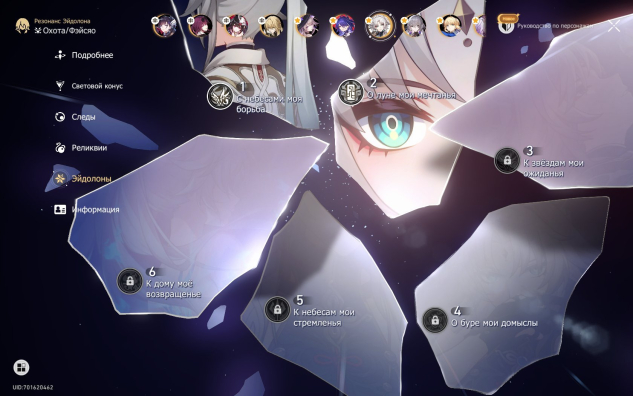 Подробное описание: Играю с релиза. Ресурсов хоть попой жуй. Закрыто почти все. Достижение тоже почти все. Самый сильный персонаж Фейсяо С2 С сигной. Броня С6 с сигной воскресенье. Проще написать каких персонажей нету. Нет дань хеня пожирателя луны. Блейда. Черный лебедь. Зарянка. Светлячок. Юнли. Цзяоцю. Линша. Воскресенье. Аглая. Мидей. Анакса. Гиацина. Фаэнон. Керидра. И темень.