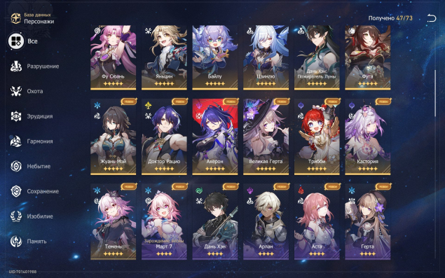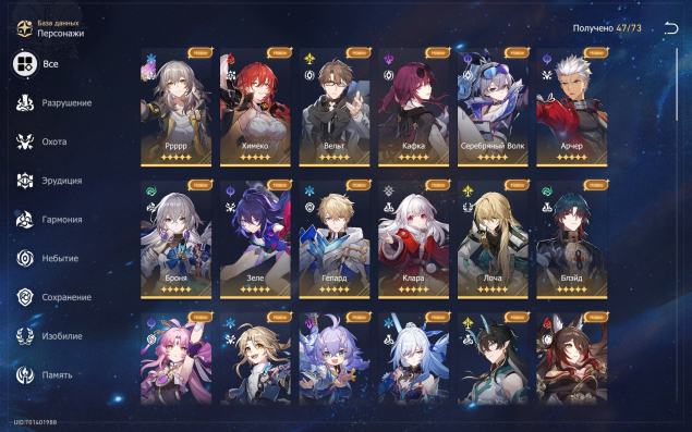 24 легендарных персонажа и 12 легендарных конусов. Персонажи прокачены достаточно хорошо, из всех можно составить уже готовые команды.