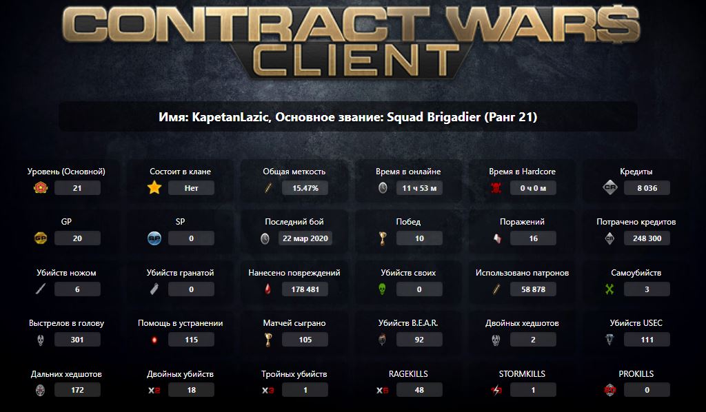 Squad Brigadier (Ранг 21), Время в онлайне: 11 ч 53 м, Последний бой: 22 мар 2020