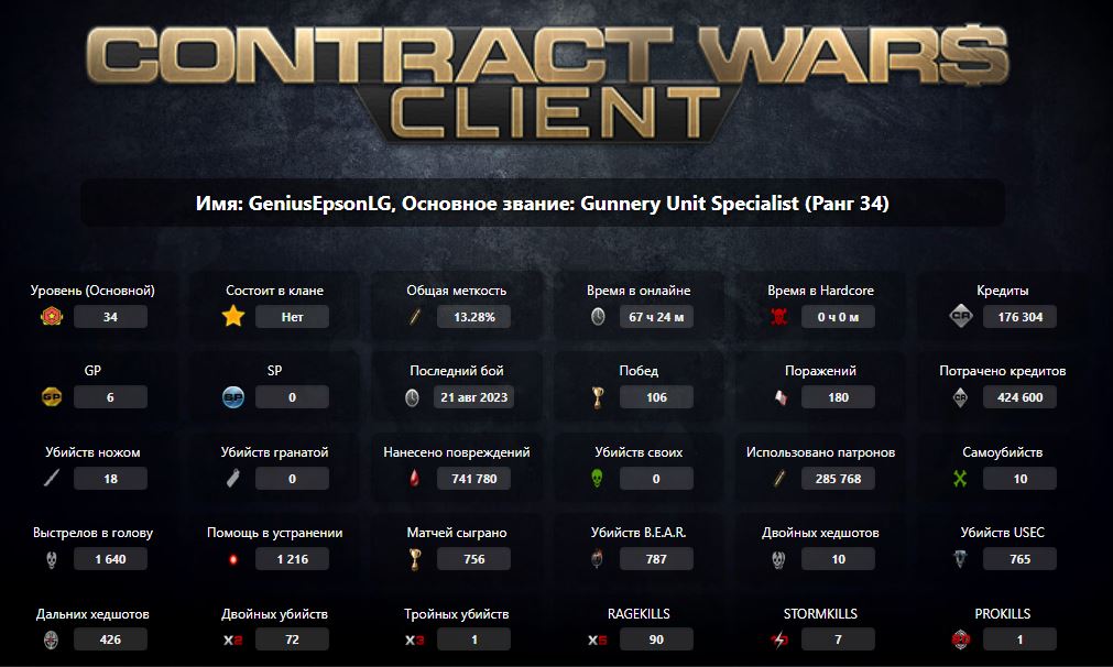 Gunnery Unit Specialist (Ранг 34), Время в онлайне: 67 ч 24 м, Кредиты: 176 304, Последний бой: 2023