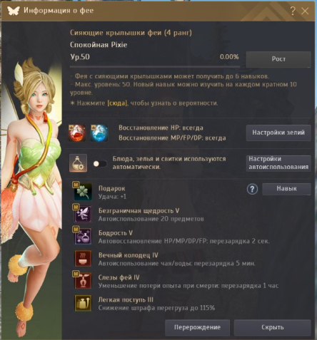 — Фея 4 ранг (высший): 5 щедрость, 5 бодрость, легкая поступь 3, 4 слезы фей, вечный колодец 4.