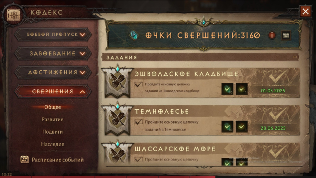(Пройдена: основная компания, 3 этап пути героя, кровавый путь закрыт на 100%, получен плащ бессмертного за 15 ранг теневого клана, открыто П9 для исследования, собрано 3160 очков свершения, МАКСИМАЛЬНЫЙ парагон сервера)