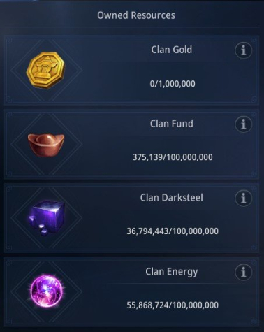 Имеются ресурсы клана в количестве: 375 139 капитал клана, 36 794 443 темной стали клана, 55 868 724 энергии клана.