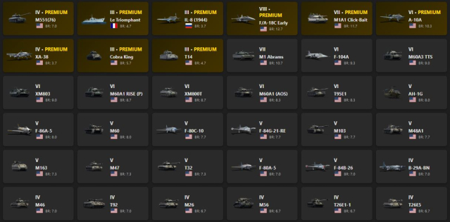 VIII - 1, VII - 2, VI - 8 M551(76), F/A-18C Early, M1A1 Click-Bait, A-10A, Cobra King, M1 Abrams, F-104A