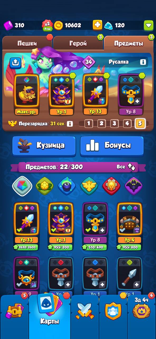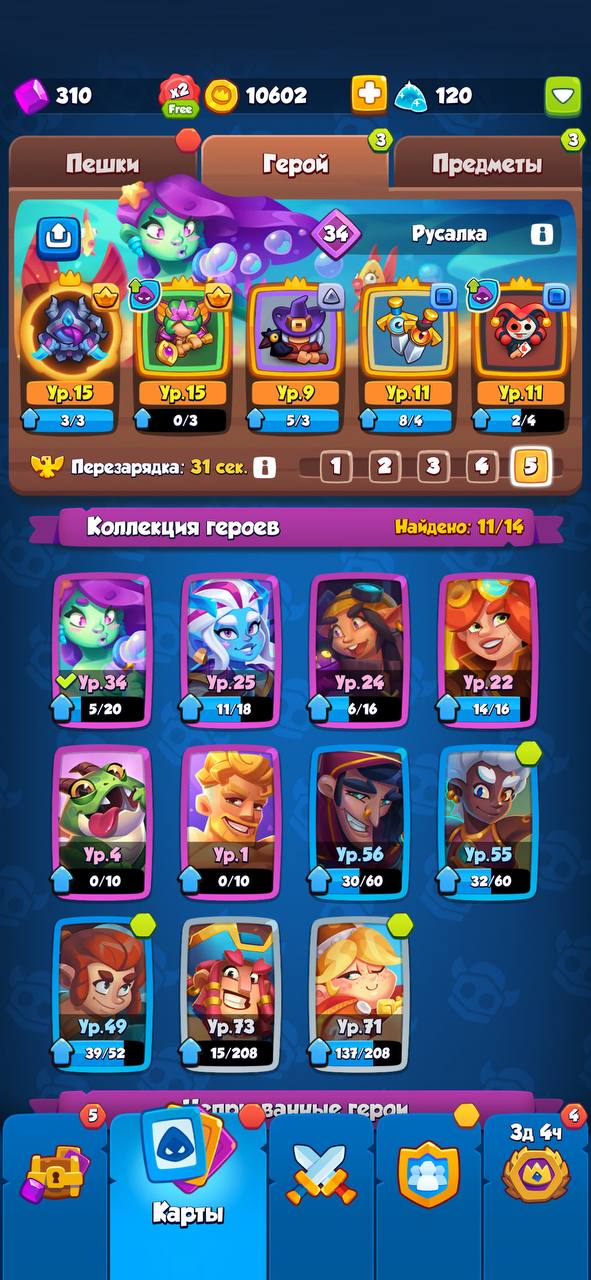 🧜♀️ Герой: Русалка ур. 34 — с отличными предметами и быстрой перезарядкой (31 сек).