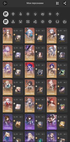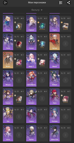 Также есть много 4★ персонажей, собраны практически все базовые герои.