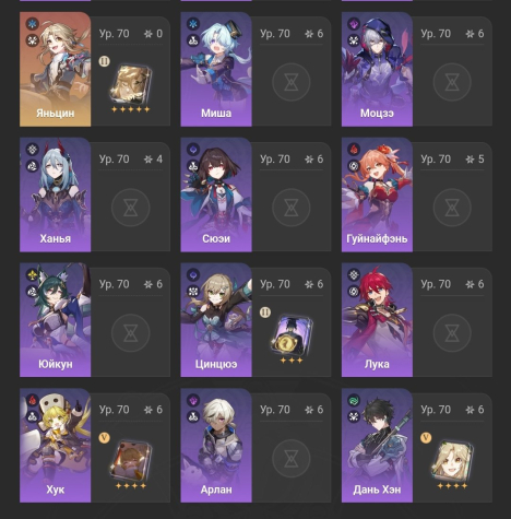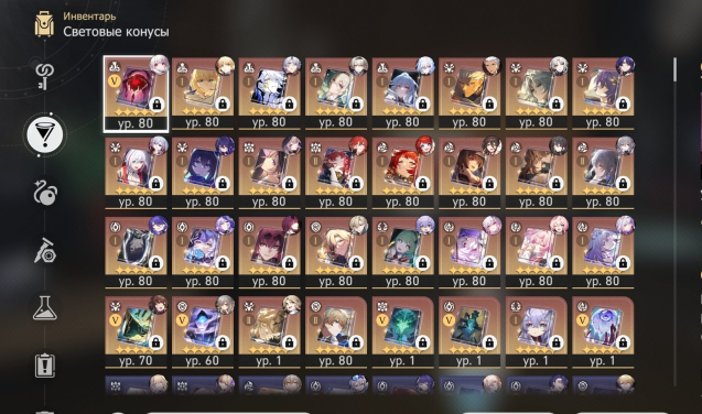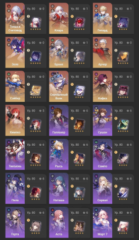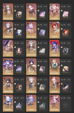 Е0 + сигнатурный конус: Темень, Сейбер, Арчер, Кастория, Фаенон, Гиацина, Светлячок, Топаз и счетовод, Великая Герта, Жуань Мэй, Кафка, Черный лебедь, Фэйсяо, Авантюрин, Цзинлю, Трибби, Зеле, Доктор Рацио, Яньцин;