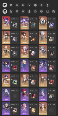 Аккаунт Genshin со множеством именных карточек и планеров. Большое количество прокаченных персонажей, которые с лёгкостью закрывают любой контент