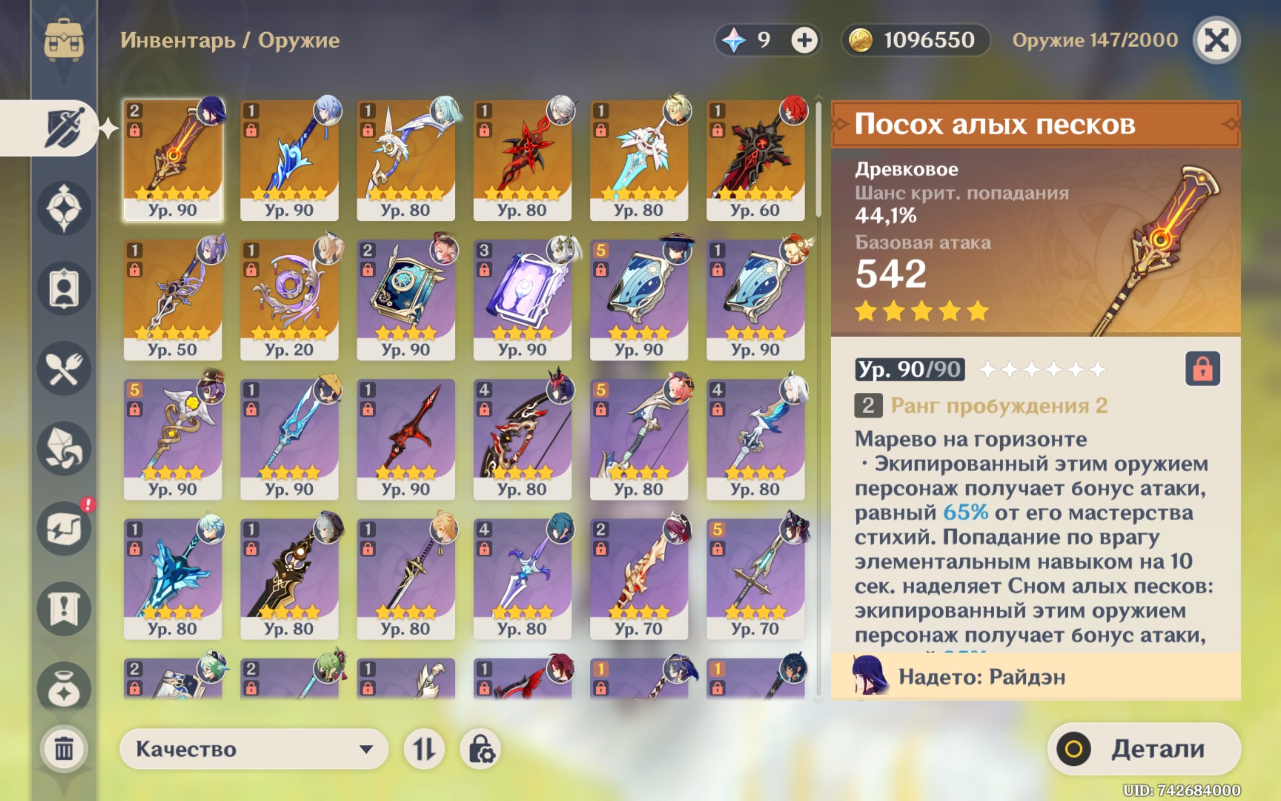 • Оружие 5*: Посох алых песков Р2, Харан гэппаку фуцу, Очертания алой луны, Отпущение грехов Вечное лунное сияние, Лук Амоса, Волчья погибель, Небесный меч.