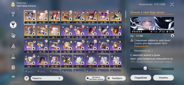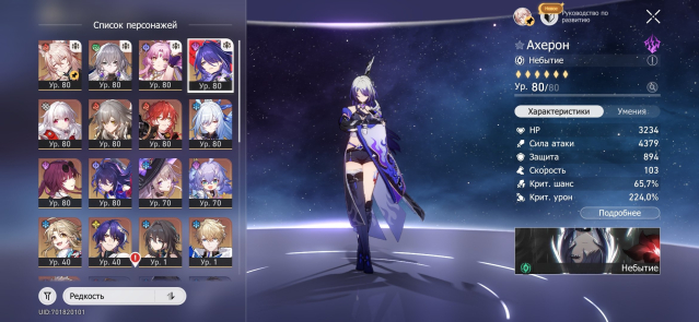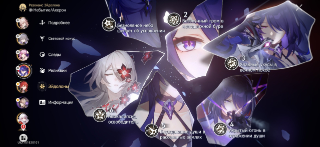 Подробное описание: ✨✨Ахерон Е6S1, Броня Е4S1, Цзяоцю Е0S1, Фу Сюань Е0S1, Цзиньлю Е0S1, Кафка Е0S1, Зеле Е0S0, Великая Герта Е0S0, Рацио Е0S0, Жуань Мэй Е0S0