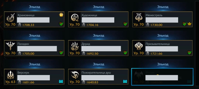 Краткое описание: Мейн Бард 1730гс. Сумка 1721гс. Храмовница 1708гс. Паладин 1705гс. Художница 1704гс. Друид 1693гс.