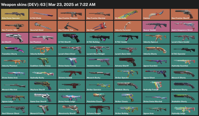 Подробное описание: Skins: Elderflame Operator, K/TAC Blade, Neo Frontier Phantom, Neo Frontier Marshal, Striker Knife, Catrina, Neo Frontier Sheriff, Neo Frontier Odin, Snowfall Wand, Neo Frontier Axe, Oni Claw, Velocity Karambit, Reaver Vandal, Gaia's Vengeance Ghost, Ion Sheriff, Ion Phantom, K/TAC Sheriff, K/TAC Bulldog, K/TAC Vandal, Velocity Spectre, Lycan's Bane Vandal, Transition Shorty, Velocity Bulldog, Lycan's Bane Ghost, Lycan's Bane Stinger, Lycan's Bane Odin, Velocity Shorty, K/TAC Operator, Velocity Phantom, Coalition: Cobra Frenzy, Divine Swine Frenzy, Vendetta Ghost, Schema Sheriff, Jigsaw Guardian, Hydrodip Guardian, Divine Swine Ares, Hydrodip Bucky, Schema Vandal, Monarch Bucky, Striker Spectre, Jigsaw Ghost, Monarch Shorty, Monarch Marshal, Wayfarer Sheriff, Schema Odin, Striker Operator, Sidekick Shorty, Hydrodip Frenzy, Karabasan Shorty, Jigsaw Judge, Game Over Sheriff, Divine Swine Judge, Pistolinha Classic, Striker Classic, Divine Swine Marshal, Snakebite Shorty, Soul Silencer Ghost, Monarch Frenzy, Monstrocity Sheriff, Schema Stinger, Striker Bulldog, Jigsaw Ares, Hydrodip Judge, Gaias Vengeance Vandal