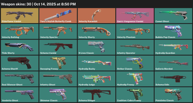 📸 Полный список смотри на скриншоте (Стильный гребень-бабочка Yoru, Керамбит Скорость, Vandal Возмездие Земли, Vandal Древнее пламя)