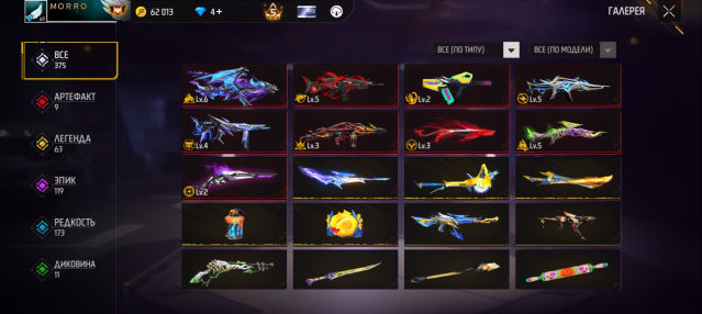 • Оружие: множество прокачанных скинов (уровни 5–6) — реальная прибавка в бою