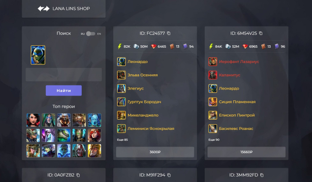 Уважаемые покупатели, в моем ассортименте десятки тысяч товаров — я и моя команда в режиме 24/7 опрашиваем игроков в онлайн-играх и собираем от них предложения на продажу: аккаунты, внутриигровую валюту, предметы/скины и выполнение услуг.