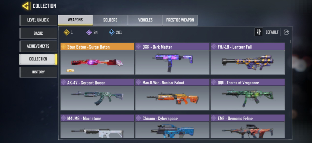 ◘ 🎯 Скины (на оружие): 1 легендарных, 94 эпических, 201 редких