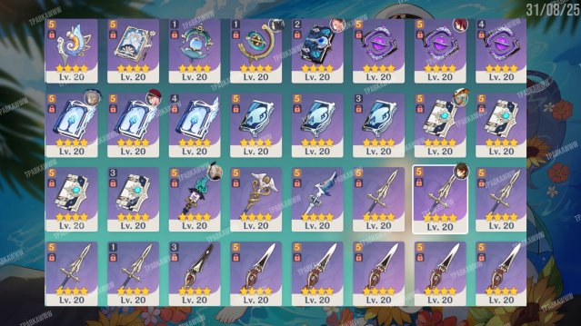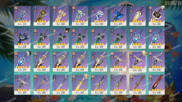 ⭐️ Легендарные оружия: Громовой Пульс, Аква Симулякрум, Элегия погибели, Лук Амос R2, Бдение Взывающего к звёздам, Обряд вечного течения, Сноведения тысячи ночей R3, Истина кагура, Великолепие лазурного свода R1, Молитва святым ветрам, Небесный атлас, Очертания алой луны, Посох алых песков, Сияющая жатва, Нефритовый коршун, Небесная ось R2, Посох Хомы R1, Тысяча ослепительных солнц, Некованый R2, Волчья погибель R1, Лазурное сияние, Отпущение грехов, Блеск тихих вод, Свет лиственного разреза, Ключ Хадж-нисут, Рассекающий туман, Клятва свободы, Меч сокола R1.