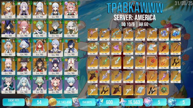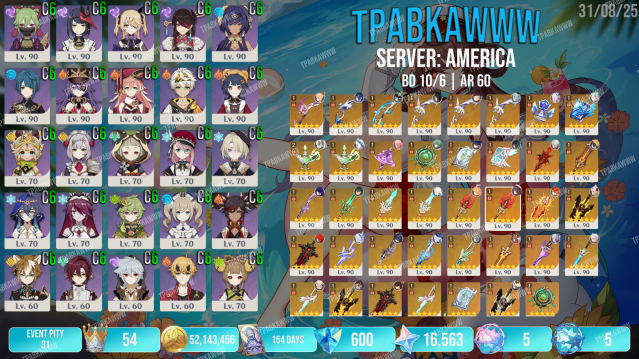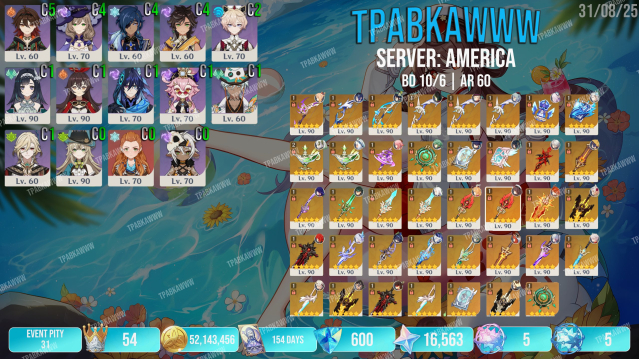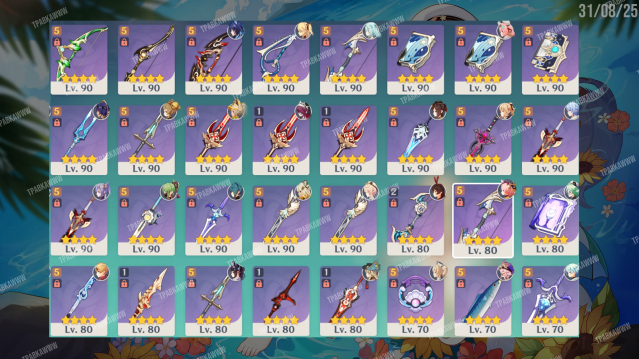 ⭐️ Легендарные ивентовые персонажи: Лаума, Скирк С2R1, Ёимия С2R1, Ху Тао С2R1 (+1 Хома не пробуждена), Мавуика С1R1, Арлекино С1R1, Райдэн С2R1, Сяо С1R1, Фурина С0R1, Невиллет С2R1, Нахида С0R2 (3 но один не пробужден, стоит на Муалани), Нилу С0R1, Венти С0R1, Аль-Хайтам С0R1, Бай Чжу С0R1, Сянь Юнь С1, Итто С1, Е Лань С0R1, Тиори С0, Вареса С0, Шилонен С0, Альбедо С0, Чжун Ли С0, Странник С0, Кадзуха С0R1, Эскофье С0, Ситлани С0R1, Шэнь Хэ С0, Гань Юй С1R1, Аяка С0R1, Клоринда С0R1, Яэ Мико С0R1, Муалани С0, Аято С0, Кокоми С0, Лини С0