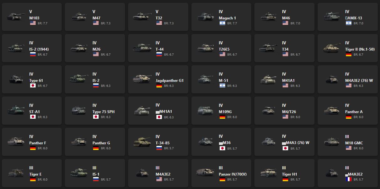 V - 3 M103, M47, T32, Magach 1, M46, AMX-13, IS-2 (1944), M26, T-44, T26E5, T34, Type 61