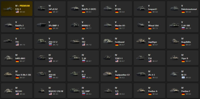 VI - 2, V - 11 F2G-1, JaPz.K A2, RakJPz 2 (HOT), DF105, Leopard I, Raketenautomat, RakJPz 2, SPz BMP-1