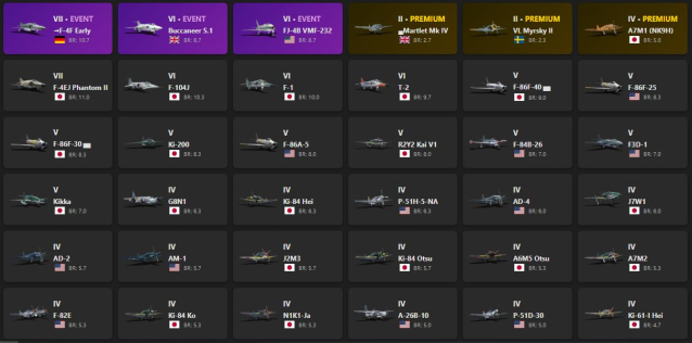 VII - 2, VI - 5, V - 9 F-4F Early, Buccaneer S.1, FJ-4B VMF-232, F-4EJ Phantom II, F-104J, F-1, T-2