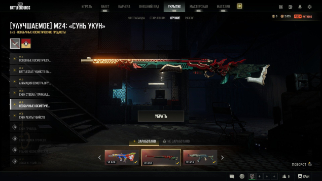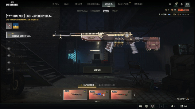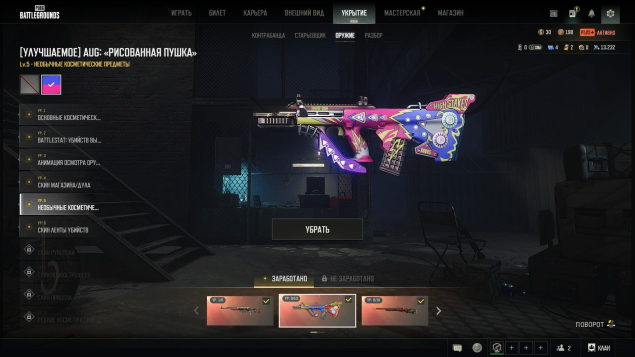 В инвентаре очень много всего редкого и занимательного, остановлюсь на основном, три прогрессив пушки 6 лвл с лентой убийств (берил лазурный дракон и ауг со схемами) м24 без схемы и еще один прогрессив ган 1 уровня СКС, также есть 4 чертежа и 13к полимеров для будущих апгрейдов, две цветные гранаты зеленый и фиол цвет и дымовой пистолет желтый. Всего инвентарь на 1825 предметов и на крафт еще лежит 40к кредитов. Есть мотоцикл дукати, астон мартин и ламба (шоурум лобби), также есть и другие скины на авто. В инструментах лежит неиспользованная карточка для смены ника для нового владельца.