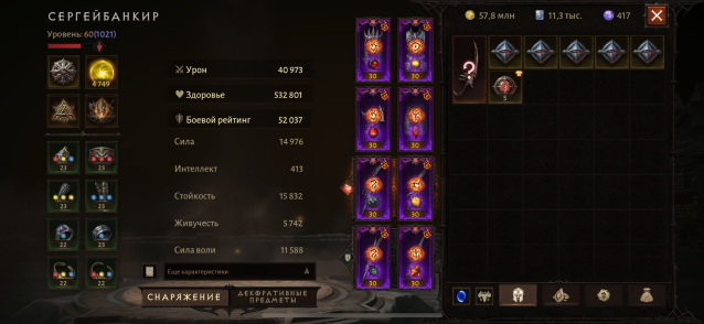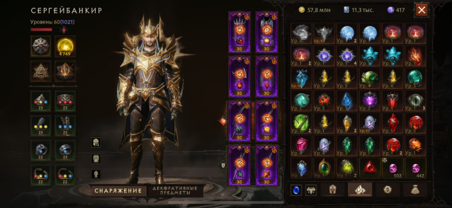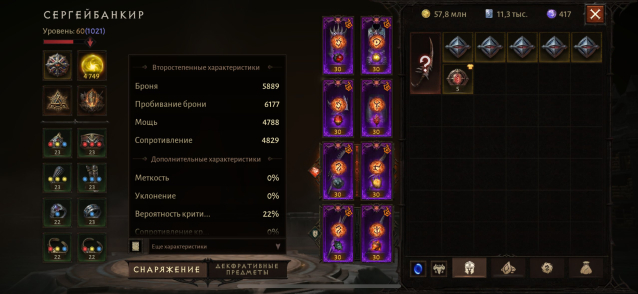 Подробное описание: Продается русский акк, макс рез. 4877, бр 53,8к. В наличие камни: кровавая льдина 4* 6 лвл, бурлящий исход 4* 6 лвл, вместилище мглы 5*, 6 лвл, окрававленый нефрит 5* 6 лвл(почти 7), желч 4* 6 лвл, надежда в бутылке 4* 6 лвл, пепел феникса 5* 6 лвл, зов ревуна 5* 6 лвл, пасть из глубин 4* 4 лвл, плач матери 10 лвл, череп скорби 10 лвл, мрачный ритм 9 лвл. Есть другие камни на 4 звезды (холодное сердце и звездный огонь). 4 сапфира, 3 аквамарина, 2 топаза, 2 цитрина, 2 турмалина 8 лвл, остальные левые камни 7 лвл. Пробивание брони 6к+, броня 5,8к, сопротивление 4,8к, мощь 4,8к. Теллурических осколков 4,8кк(можно сделать любой камень одно и двухзвездные), эфесов 40к, много материала и корма для прокачки. Все руны легендарные, пет кот со спасителем. Персонажем постоянно играю, лвл и бр регулярно поднимаю.