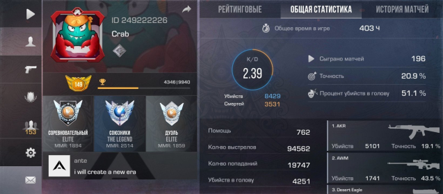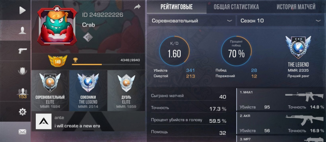 Подробное описание: 💎Скины на 8200+ голды💎 баланс 57г, 💎💎 1 легенда, 2 элиты💎 красивое айди 💎