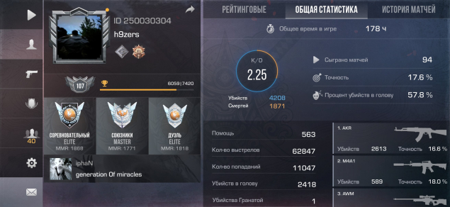 Звание: EliteКраткое описание: топовый аккаунт для новичка,178ч красивый айди 250030304