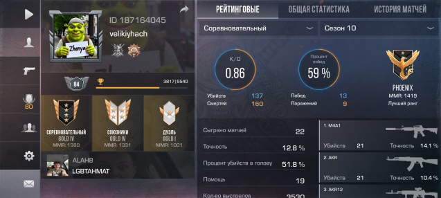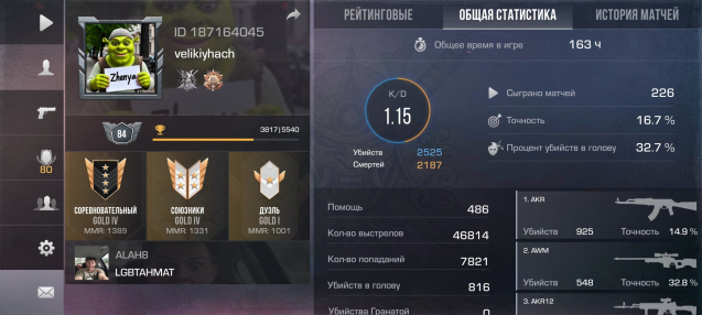 Звание: Gold lllКраткое описание: 12к+ 2(есть m9 ножа, 2 перчаток, много дорогих скинов.