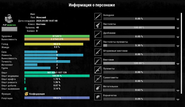 Сервер: RU-3Краткое описание: ⭐Охотник 40 Уровень (Конфедерация) Винтовки — 100%, Пистолеты 100% STEAM аккаунт⭐