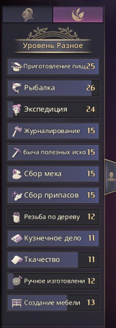 6) Сбор ресурсов макс уровень, переработка ресурсов 12,11,11,13 уровни, мебель 13 уровень