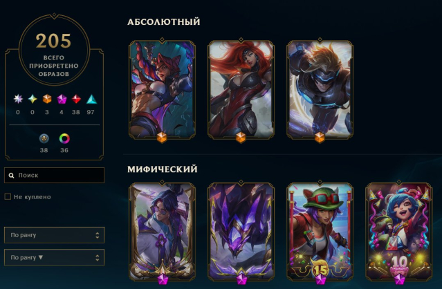 Подробное описание: 3 абсолютные, 4 мифические, 38 легендарные, 97 эпические образы. 36 цветовых схем, 248 эмоций, 5 страниц рун, 199 иконок с которых: 8 мифические, 1 легендарных, 8 эпические и 130 редких, все начальные серия и серия 1 вечных