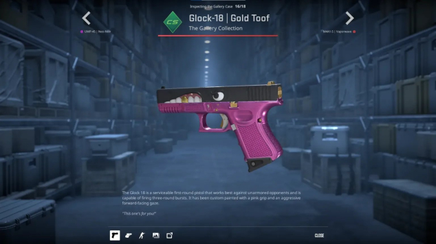 Подробное описание: 🦷 Glock-18 | Золотой зубок — стильный пистолет с золотыми акцентами и блестящей отделкой, который придаст вашему стилю яркий и дерзкий вид! 💥