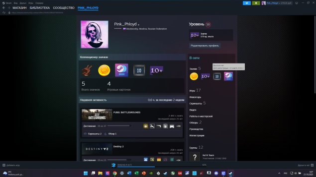Платформа: PCКраткое описание: Личный аккаунт Steam 10 лет CS 2 PUBG Destiny 2 DbD и другие