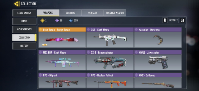 ◘ 🎯 Скины (на оружие): 1 легендарных, 96 эпических, 155 редких