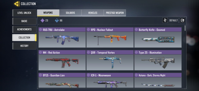 ◘ 🎯 Скины (на оружие): 23 эпических, 86 редких